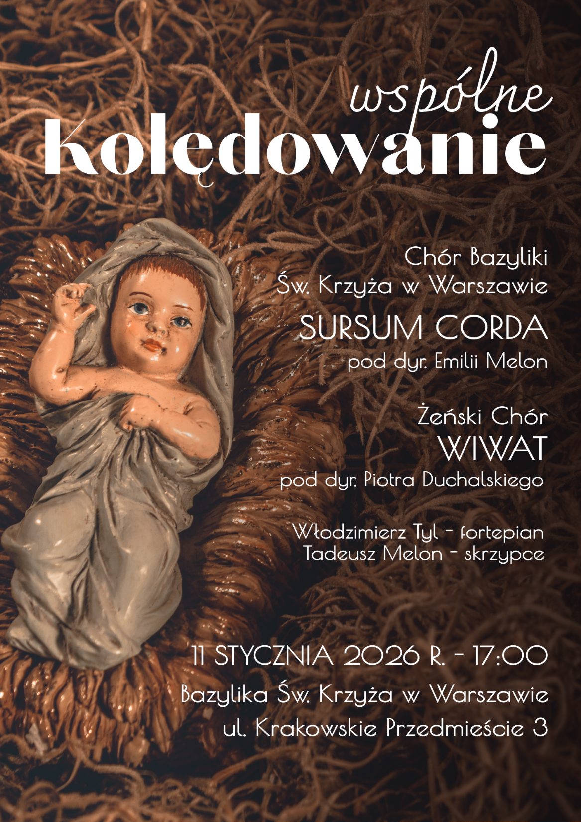 Późnym popołudniem odbyło się kolędowanie w Bazylice pw. Świętego Krzyża przy Krakowskim Przedmieściu w Warszawie. My oraz Chór Sursum Corda pod dyrekcją Emilii Melon wykonaliśmy przygotowane kolędy. Całość przepleciona była wspólnym kolędowaniem z licznie zgromadzoną publicznością.